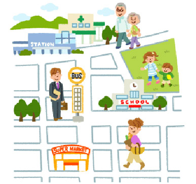 生活・学習環境:最寄駅やスーパー、病院など生活のための施設はそこでの生活を創造しながらシミュレーションしてみましょう。ポイントは直接現地を歩いてみること。地図だけではわからない、騒音や周囲の自然環境や小さなお店などにも気づきやすく、「土地柄」を知るのにとても効果的です。