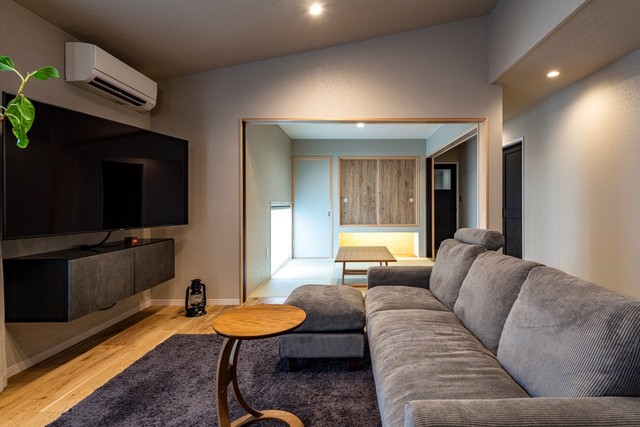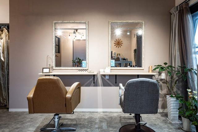 美容室との店舗併用住宅です。おしゃれで落ち着ける美容室とグレイッシュでかっこいいリビングに仕上げました。