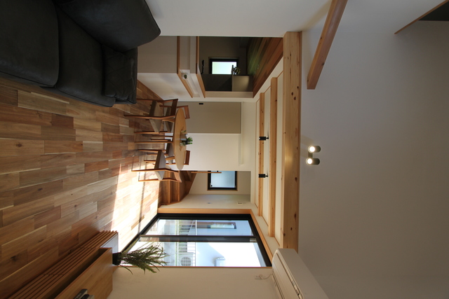 住まうほどに味わいを増す無垢材の床。日々の家事を心地よく整える回遊動線。帰宅後すぐに手を清められる玄関手洗いを配し、前面道路からのゆるやかな目隠しにもなる、外部収納のある住まいが完成しました。