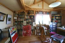 アトリエ内部の床や壁は素地(構造用パネルのままの)仕上げのため、釘を自由に打てるし、棚もどこにでも取り付ける事が可能。「とっても重宝しています。絵の具の汚れもそんなに気にすることないしね」と微笑みながらお手製の棚を見せてくれました。そこには数々の美術書が並ぶ。