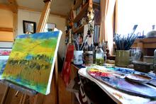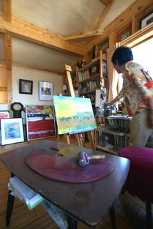 訪問した時、奥様は、展覧会を終えて一段落付いた時であった。天井を高くとった2階のアトリエに、奥様の数知れぬ絵画と共に絵の具、筆、イーゼルなど画材道具が点在している。南側に大きな開口部が取られているため、アトリエ内部は明るい。その窓の前に腰掛け、イーゼルに向かう奥様。この席からは、外ののどかな風景や心地良い風、明るい光、その全てが気持ちよく、制作への威力が沸いてくるという。
