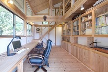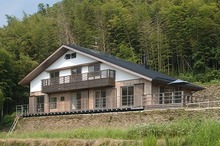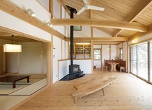 敷地は、玄界灘を望む、周囲を山の緑に囲まれた西斜面の南北に細長い棚田跡。木造軸組工法で周囲の環境になじむ大屋根のおおらかな外観と国産の木をたっぷり使った伸びやかで、心癒せる住まいです。 日照や自然の風と空気の流れを考慮し開口部を設置しています。合板は使わず、柱、梁、造作材は、杉、床板は40ミリの厚板を使用しています。 漆喰、竹紙などの自然素材も使用して、雨水利用や高性能な生活排水の浄化システムも設置しています。