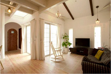 このような住宅を建てようと決意されたのは、ギリシャのサントリーニ島を訪れたとき、地中海を見渡す家々の丸みを帯びた白亜の建物に目を奪われたそうです。ご入居されて家の中も生活感が出てきました。たまの来訪者も普通とは違う家の造りに関心されるとか。もちろん、時間が経って味わい深い家の仕様、“経年美の家”にしています。 フランスの外壁材と室内のフランス製漆喰で、雰囲気も出ています。基本色はサントリーニ島の白い建物とマリンブルーです。バルコニーの十字のくり抜きもオシャレさのポイントになっています。 室内は柔らかい雰囲気を出すため、Rの建具や丸みを帯びた壁を多用しています。リビングの一部はタイル張りにして変化をつけています。
