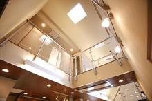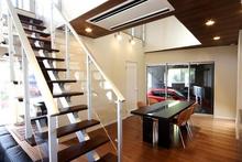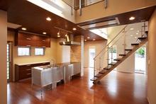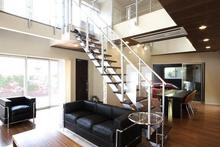 一見、木造とは思えないような大胆な設計と、メーカーとのコラボレーションによりスタイリッシュでモダンな住宅が生まれました。新しい施工方法や新商品を随所に採用し、おしゃれで機能的な住空間になっています。車好きのご夫婦のこだわりで、リビングダイニングや書斎から車庫の車が見えるように設計したのがポイントです。また、ブリッジが架かった吹き抜けの空間がこの家の魅力を一層ひきたてています。