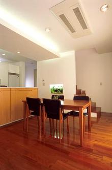 自然豊かなロケーションを配慮し、シンプルモダンを意識しつつも、温かみのあるデザインでまとめた外観。オーナーのご希望は、「四季を通じて温度差のない快適な住宅」でした。そこで24時間温度設定ができる「新床下空調換気システム」を導入。外の新鮮な空気を取り入れながら、湿気や臭気などで汚れた室内の空気を出し、室内を快適な温湿度の状態に保つシステムです。また、床下のコンクリート面には断熱材を施工しその表面には、空気を浄化し、有害物質を吸着する自然素材の液状炭を塗布。他に、エコ給湯器をりようしたオール電化を採用、デザイン性と機能性を併せ持つワンランク上の住宅です。