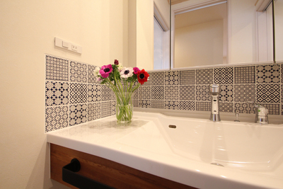 白い塗壁に明るい色の素焼瓦が異彩を放つ家
