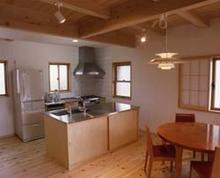 玄関を入ると、ホールを中心に左右に親と子の世帯が分かれ、ある程度プライバシーを保てるように工夫されていて、広い吹き抜けのある25帖を超えるリビングと和室はゆったりとした空間に仕上げっています。また、キッチンはシステムキッチンではなく、サン建築工房オリジナル造作キッチンで動線と収納を細かく考えた、とても使いやすいキッチンになりました。