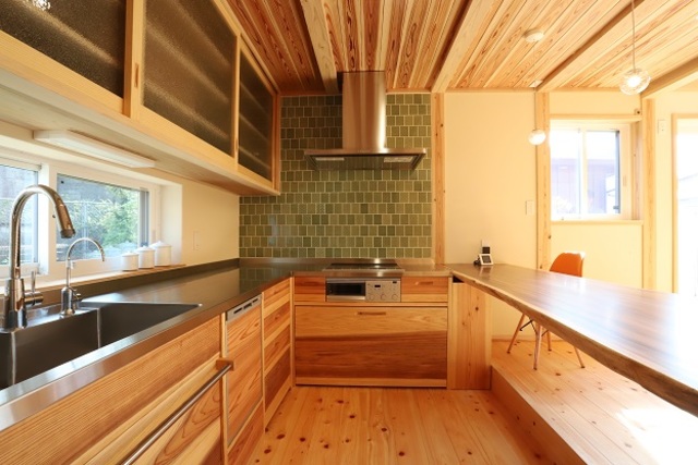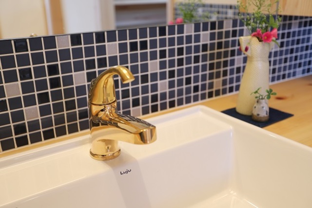 藤丸建設のインスタグラムで大人気だったひらさんち。 キッチンの一部の壁にアクセントをしてタイルを。 対面のカウンターの足元はあえてオープンにしました。 洗面所のタイルとゴールドの水栓金具の雰囲気がかわいい。 二階には子供達がみんなで勉強できるような大きなカウンターを造りました。