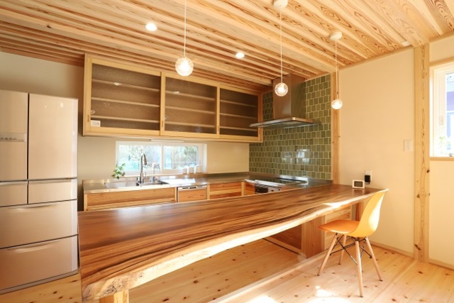 藤丸建設のインスタグラムで大人気だったひらさんち。 キッチンの一部の壁にアクセントをしてタイルを。 対面のカウンターの足元はあえてオープンにしました。 洗面所のタイルとゴールドの水栓金具の雰囲気がかわいい。 二階には子供達がみんなで勉強できるような大きなカウンターを造りました。
