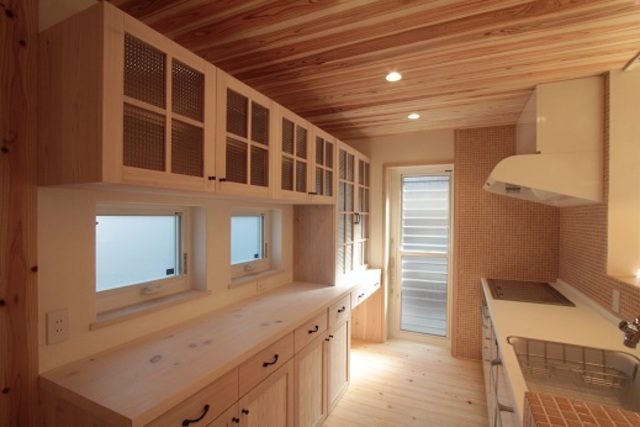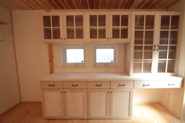 「藤丸建設の家は和風だから・・・」と思う方も多いと思いますが、洋風のお家も出来るんです!という物件(^-^)キッチンの前のカウンターには可愛らしい小さ目のタイルを敷き詰めて、手造り食器棚の建具はオフホワイトで塗装。黒の取手がアクセントになって可愛らしい雰囲気です。