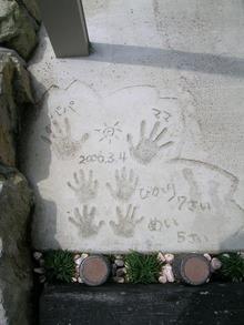 家の中の写真を撮っていると、子供達が『僕、毎日これするんで』と自慢そうに私に言ってきました。何をするのかと思えば、階段手摺を滑って遊び始めました。どうりで床や柱よりも手摺だけがツヤツヤしていると思ったら・・・ 毎日滑っているそうですよ(^▽^)私も昔、よくしたものです。毎日滑っているから、ツヤツヤ☆お母さんのお掃除の手間もはぶけます♪ 駐車場のコンクリート部分には思い出の手形。桜が咲く季節に完成したので、桜の形の中に手形をしたそうです。 写真を撮る時に気持ちが温かくなりました。ついつい自分の手を合わせてみたりしました。