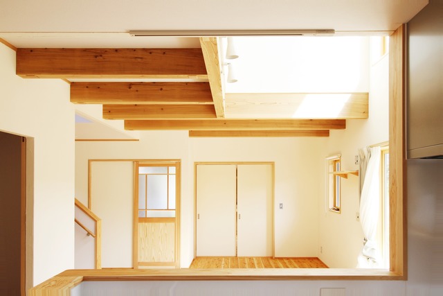 造作建具はついつい見とれてしまうくらい種類豊富なガラスを取り入れ、そこを抜けてくる光に優しい趣を感じれる室内。