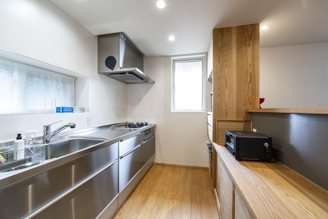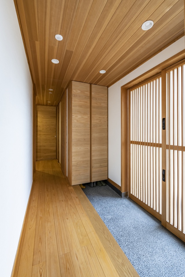 九州産の木材など質の高い木材を使用したこだわりの住宅。小上がりの畳リビング。その上部に吹き抜けを設けることで「抜け」のいい目線と開放感が生まれ 住み心地が良くなる。