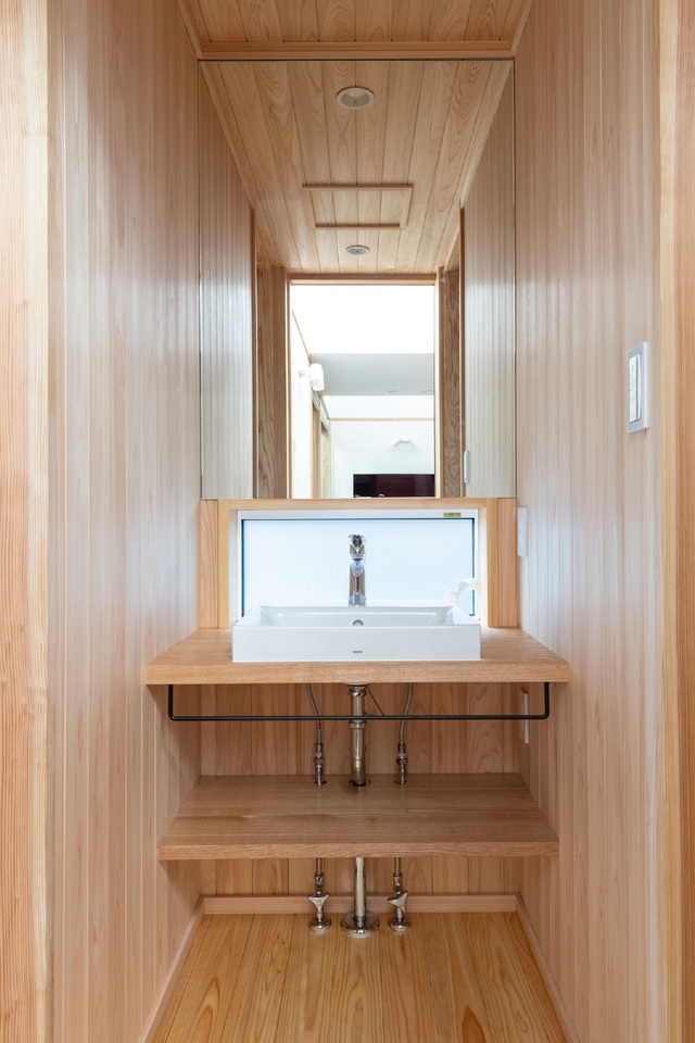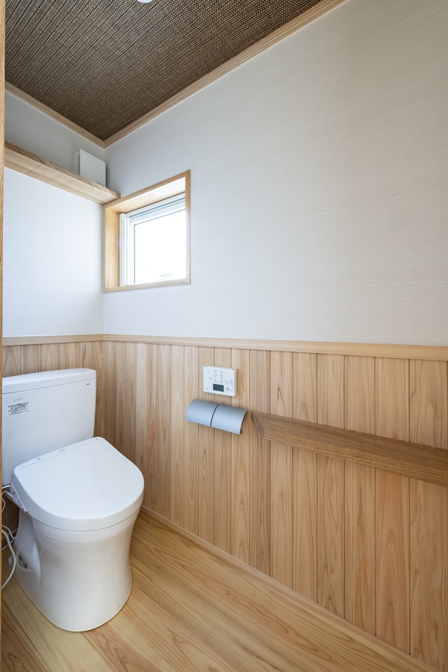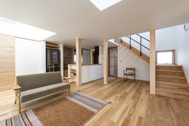 木をふんだんに使って、1階の壁は漆喰の塗壁に。断熱性や気密性が高い上に自然素材のおかげで寒い季節も暖かい。はだしで歩くのが気持ちいいくらい。1階でほぼ生活ができるよう平屋ベースの戸建てで2階は子供室・フリースペースというシンプルな間取りとなっている。気分良く一日を始められる木の住まい。