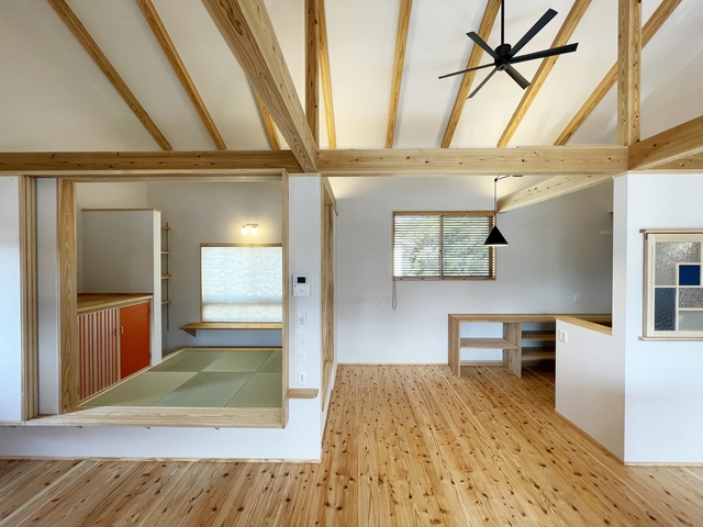 勾配天井と広いバルコニーにも続く開放感たっぷりのリビングは自然と家族が集まる空間。