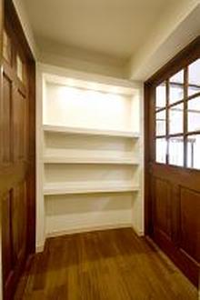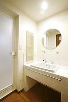 目的のひとつ『バリアフリー』を踏まえ、小間切れだった部屋をオープンな間取りに変え、部屋全体の床をフラットにつなげるとともに、引き戸を多用しました。二つ目のキーワードは『自然素材』。壁、天井は一部を除き、全て珪藻土仕上げ、フローリングや建具、ブラインドは無垢材で統一しました。また、デザインにも手を抜かず、白いタイル貼りのキッチンと洗面台はお施主様こだわりのオリジナル仕様。小柄なお施主様にも使い勝手のよい高さに設定するなど、機能性も重視しています。造り付けの収納にも間接照明やガラス棚を設け、おしゃれな仕上がりに。