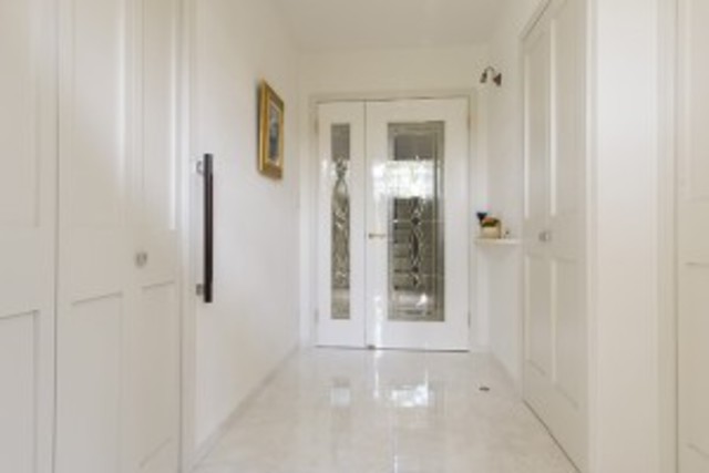 玄関はホールを広くして収納も両サイドにつくりました。玄関ホールのドアはステンドグラスを入れて親子で造作しました。とても重厚な感じです。