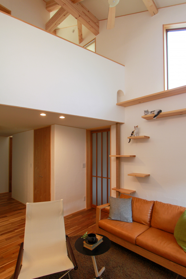 さらに吹き抜け空間を活かして、梁や中二階へとつながる動線を作れば、猫の行動範囲はぐっと広がります。収納や階段上のデッドスペースに通路を仕込み、猫だけが通れる小窓を設けるなど、設計段階ならではの遊び心ある工夫も可能です。