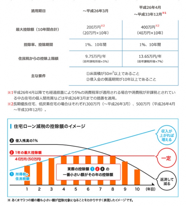 この住宅ローン減税制度は、平成26年4月からの消費税率の引上げにあわせて、下表のとおり大幅に拡充されています。