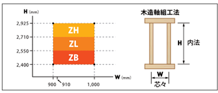 特徴1・・・幅広い適用範囲 ほとんどの架構で採用できるように、幅広い適用範囲(W900~1,000mm、H2,400~2,925mm)で大臣認定申請を予定しています。