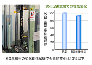 「TRCダンパー」は、約60年相当の加速試験で、性能変化が10%以下であることを確認しています。「TRCダンパー」の特殊粘弾性ゴムは、時間経過や温度による性能の変化が少ないため、メンテナンスがなくても、優れた効果を持続することができます。経年変化は非常に小さく、耐久性は充分であることと、破断面も粘弾性体破壊であり、接着性も充分であることを確認しています。