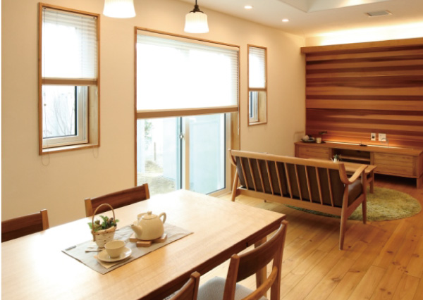 自然素材の天然の無垢フローリングと3層樹脂サッシでおうちの中はいつもあたたか