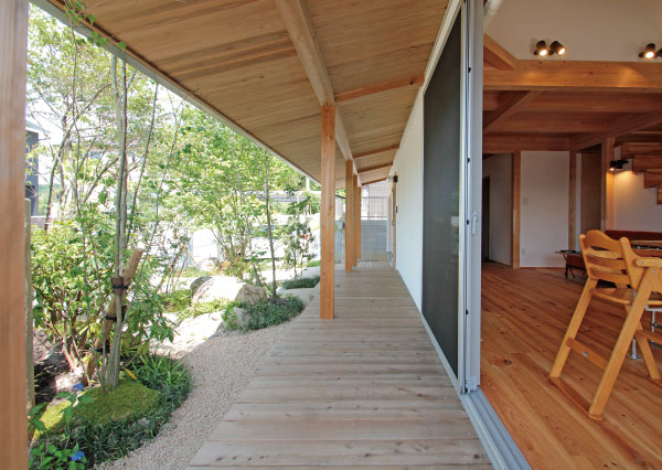 吹き抜けのあるリビングから繋がった深い軒のかかった広い縁側は、家族のもう一つのお気に入りの場所。木漏れ日の下で緑の風を感じながら、裸足で元気に走りまわる子どもたちが印象的。