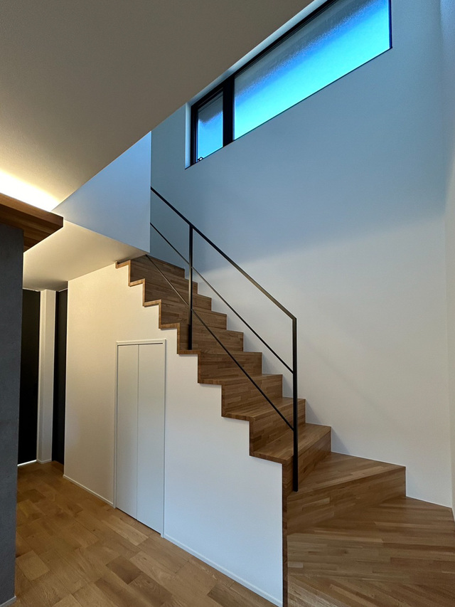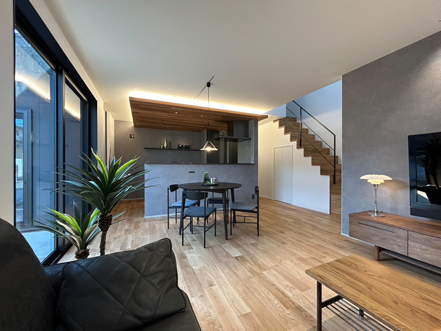 ご夫婦の理想、「スタイリッシュにかっこよく」をかたちにしました。 モノトーンインテリアと木の質感が調和したデザイン。吹き抜けとオープン階段で開放感をプラス。 キッチンの下がり天井×間接照明のあかりでホッと癒される空間を演出しました。