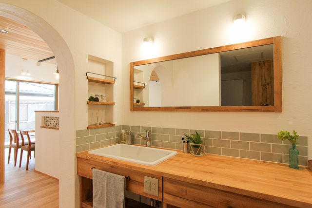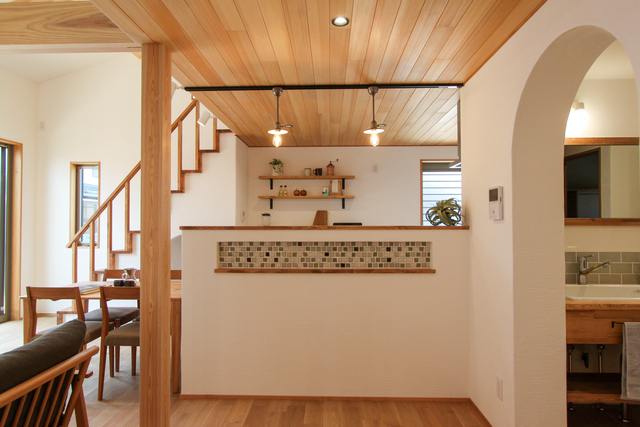 また、リビング階段は、居住空間のアクセントとして、洗面所へ向かう入り口はアール開口とし遊び心をチョイスしました。