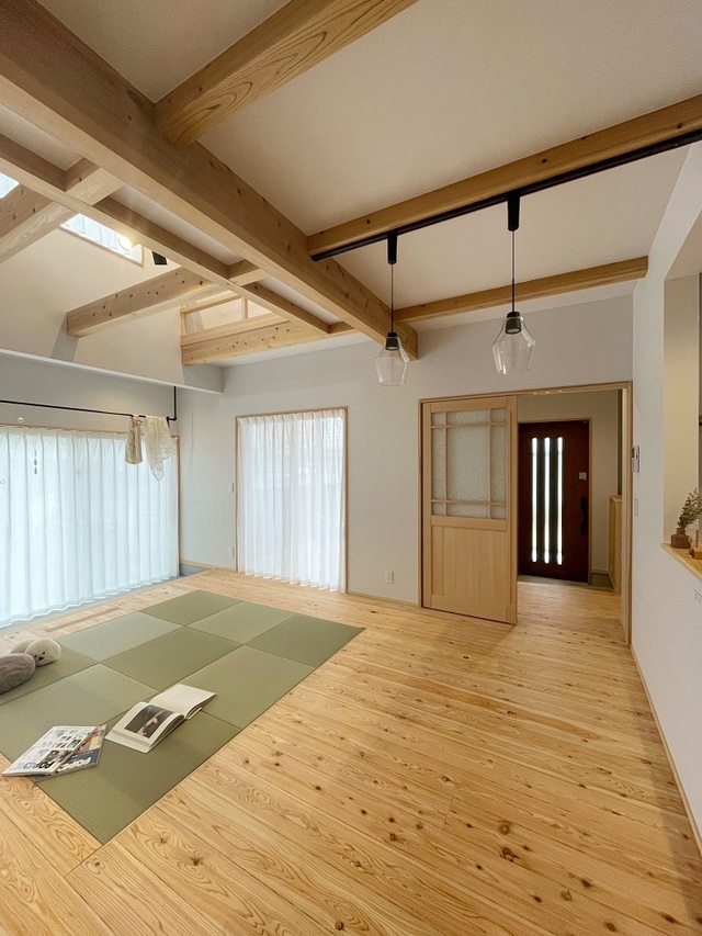 杉の床板と畳の相性がばっちりなリビング。和モダンな雰囲気を醸し出していますね。リビングの横には植物土間を設置。大きな窓から太陽光が差し込み、植物たちにもうれしい空間に。水をこぼしても掃除の手間が省けます。黒いタイルが輝くのは爬虫類系ペット専用のお部屋です。水回りやコンセントの位置にこだわりました。暮らしの中の趣味の時間を楽しめるお家の完成です。YouTubeにルームツアーの動画を載せておりますのでぜひご覧くださいね。