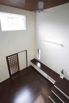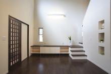 外観はスタイリッシュに一部自然素材を使って仕上げていますが、違和感のないように、サッシや破風、軒裏、樋、塗装方法などに気を使っています。 玄関ポーチからリビングまでを段差がないようにしましたので、すっきりした空間になりました。 リビングのこだわりは壁面の造作ローボードと階段の段板を一体にし。違和感をなくしたところです。 キッチンはPタイルの床にしました。