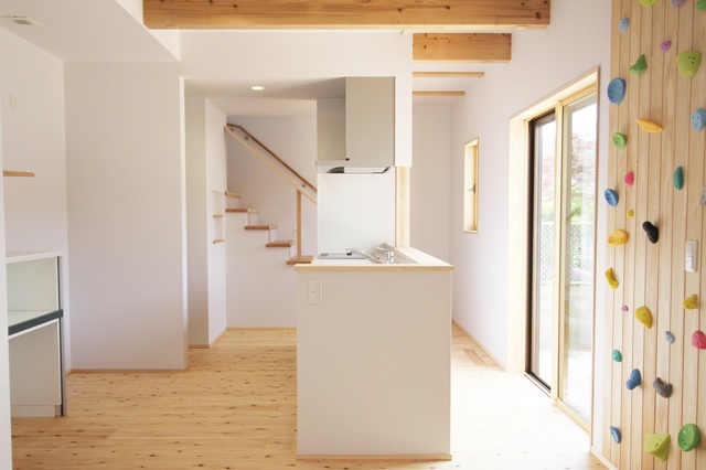 メープルの無垢材の床や天井の梁、珪藻土の塗り壁などで造られたリビングは、天然素材ならではの温もりが溢れる空間となっています。