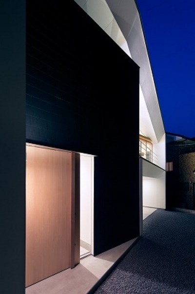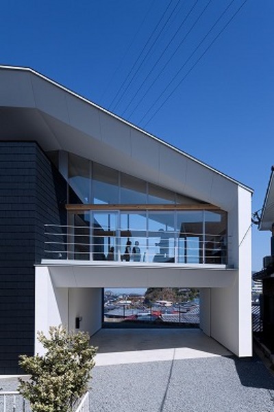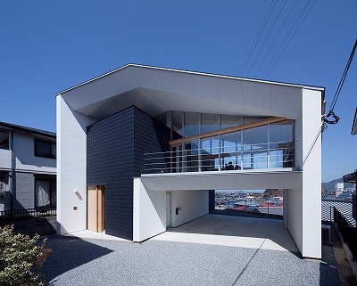 設計:イノウエサトル建築設計事務所 穏やかな大村湾を見渡す丘陵地に、その家を「普通じゃない」オーラを放ちつつ建っている。急傾斜の屋根に、空と海を見晴らす開放感いっぱいのカーポート、まるで空中に浮かんでいるような二階リビングが特徴の建物です。