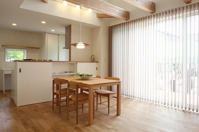 吹き抜けを計画した開放感あるリビングダイニングは、白を基調とし、木のやさしさが家族を包み込んでくれる家に仕上がりました。