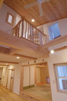 津江杉の無垢材を一面に張った床と、珪藻土で塗り上げた壁。自然素材に満ちた心地よい空間になりました。仕切りのない伸びやかなリビングダイニングは奥様がご希望されました。和室もつながっておりお子様のお昼寝コーナーになっているとの事。 育児に家事に忙しい毎日を過ごす奥様達にとって、ホームペーティーは気の合う友人と笑い会える貴重な空間になります。2階キッズルームは吹き抜けとつながっておりいつでもお子様の気配を感じていただけます。大きな玄関収納・リビングから広がるウッドデッキもこだわりの場所です。(奥様)