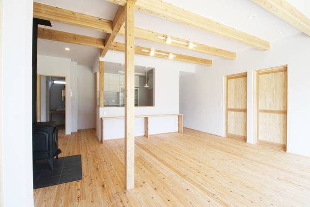 のどかな田園風景の広がる敷地に建てられたシンプルながらもデザイン性も重視した平屋。 そしてリビングからは山の稜線まで見渡せることができ、景色を存分に愉しめる住まい。 LDKの一角には薪ストーブを設置し、冬は家全体を心地よく温めてくれます。 平屋ならではのリビングを経て各部屋に繋がるセンターリビング設計で、家族の会話も自然に増えます。