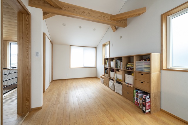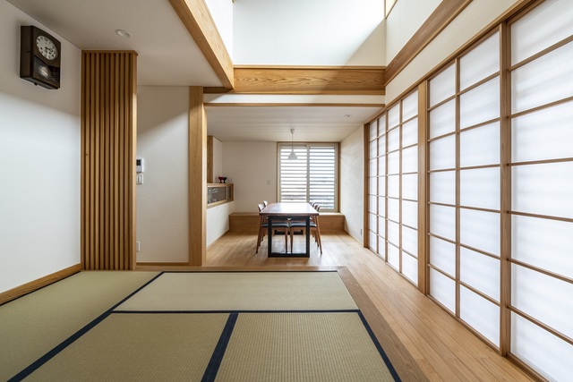 九州産の木材など質の高い木材を使用したこだわりの住宅。小上がりの畳リビング。その上部に吹き抜けを設けることで「抜け」のいい目線と開放感が生まれ 住み心地が良くなる。