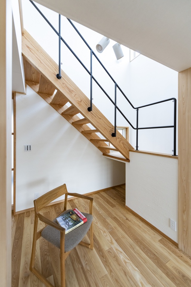 木をふんだんに使って、1階の壁は漆喰の塗壁に。断熱性や気密性が高い上に自然素材のおかげで寒い季節も暖かい。はだしで歩くのが気持ちいいくらい。1階でほぼ生活ができるよう平屋ベースの戸建てで2階は子供室・フリースペースというシンプルな間取りとなっている。気分良く一日を始められる木の住まい。