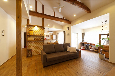 極力自然素材を使用し、お施主様お気に入りのインテリア雑誌を参考に、遊び心のあるデザインに仕上げました。無垢材の付け梁や横木、珪藻土クロス、そして 以前和室だった部屋の床には夏でも足ざわりのよい サイザル麻のカーペットを敷き詰めました。ご主人こだわりのCD棚も無垢材を使用し、味わいのある仕上がりになりました。 垂れ壁の開口、建具の小窓、壁のニッチを四角形のデザインに統一し、まとまりのあるかわいらしい空間が 誕生しました。