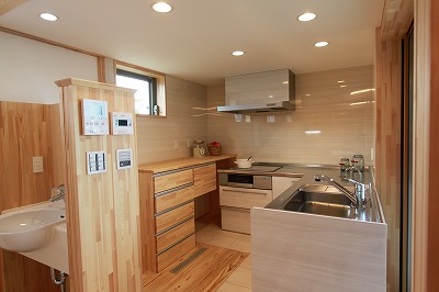 南側に配置した明るいキッチンは奥様のこだわりです。キッチンからはリビングとつながったデッキが見渡せます。全開口サッシでリビングとキッチンを一体化、空間がより広く感じます。