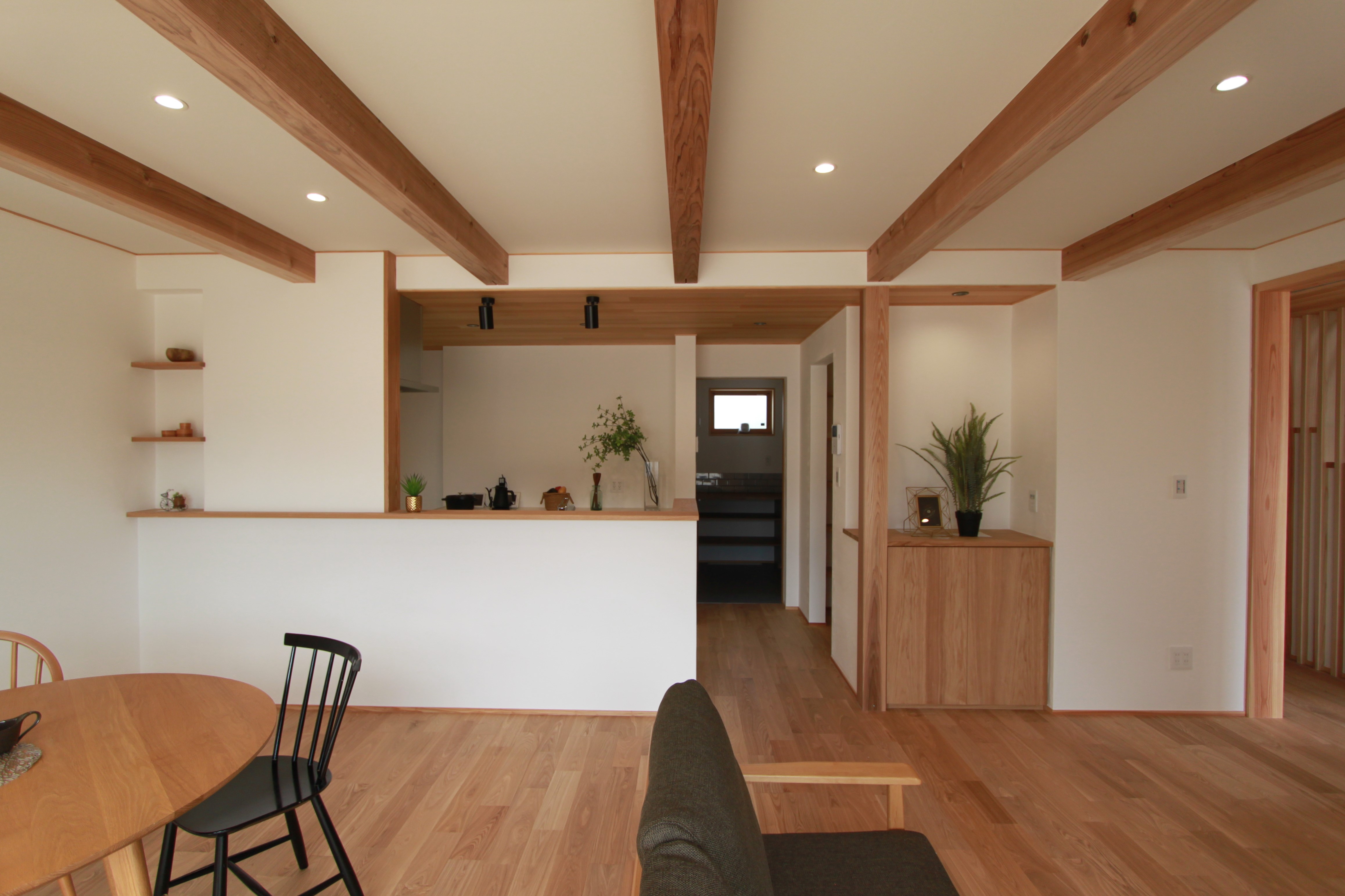 ・家の中をグルっと回れる行き止まりのない回遊動線とし、すべての部屋にその回遊動線上からアクセスできるようにすることで、家事や全ての手間を楽にしています。
