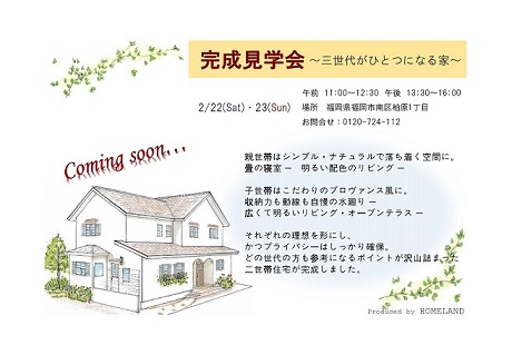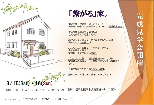 3月*新築 完成見学会 2月 22nd, 2014 お知らせ, 未分類, 現場情報, 見学会情報 こんにちは(^O^) (株)ホームランドです。 今回の見学会は見るべき箇所盛り沢山の 長期優良住宅です♪ 小さな土地を上手に活用した とても参考になる設計。 内装も奥様のこだわりが沢山。 プロヴァンス風で、経年美仕様でありながら 家族各々の動線がしっくり繋がる シンプルな間取りです。 日時:3/15(土)16(日) AM11:00~PM12:30 PM13:30~PM16:00 場所:福岡市城南区樋井川4丁目29 ↓お問い合わせ・ご予約は↓ 0120-724-112 是非お気軽にご来場ください♪ 経年美の2世帯住宅*完成見学会 2月 8th, 2014 未分類 こんにちは♪ (株)ホームランドです(^^) 間もなく! 経年美の2世帯住宅が完成いたします! 完全オーダーメイドの注文住宅ならではの こだわりいっぱいの2世帯住宅です。 どんな世代の方にも参考になる要素盛り沢山です。 日時:2/22(土)・23(日) AM11:00~PM12:30 PM13:30~PM16:00 場所:福岡市南区柏原1丁目 この機会をお見逃しなく! お気軽にご来場ください。 ↓お問い合わせ・ご予約は↓ 0120-724-112迄