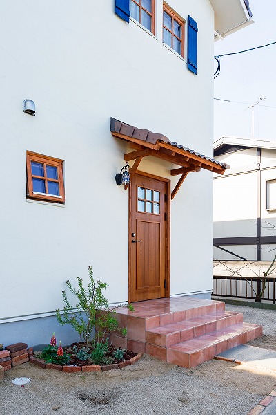 ブルーの窓飾りがアクセントの外観。S字瓦に塗り壁の外壁、木製の玄関ドアや窓もコティの標準仕様。