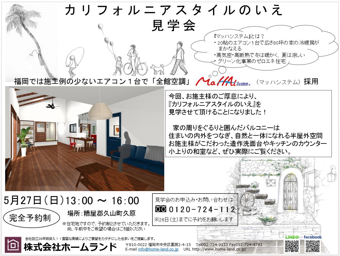 「カリフォルニアスタイルのいえ」見学会 5月 20th, 2018 未分類 ~ホームランドより、イベントのお知らせです~ * * * カリフォルニアスタイルの平屋をイメージした開放的なリビング、L字デッキで庭を囲むプランで室内と屋外の一体感を演出。 リビングやプライベートルームから気軽に屋外へとアクセスでき、家族や仲間、自然とのゆるやかなつながりを生み出しています。 これからの季節はデッキでBBQをしたり、星空を眺めながらビールを飲むなんてのも気持ちがいいでしょうね ゆったりとした時間が流れる空間、体感してみませんか? ぜひ、ご来場お待ち致しております。 マッハの家住まいながらモデルハウス見学会 5月 15th, 2018 未分類 ホームランドより、イベントのお知らせ *5月イベント情報* マッハの家見学会開催 日時 2018/5/20(Sun) AM11:00~12:00 PM13:00~15:00 毎回ご好評いただいておりますマッハの家見学会を開催いたします エアコン1台で家中の冷暖房をまかなえる画期的なシステム住宅です モデルハウスではなく、実際に住んでおられるお施主様のお話もお聞きできますし、 ぜひ、ご自身で体感してみてください また、デザインも平屋の一軒家で吹抜けや無垢のフローリングなど、 お施主様のこだわりがいっぱい詰まっており、 インテリアに興味のある方もぜひ、ご来場ください