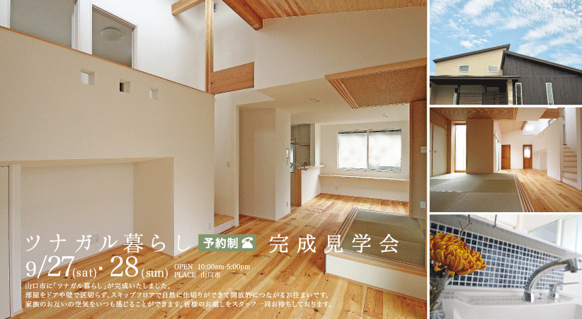 山口市に「ツナガル暮らし」が完成いたしました。部屋をドアや壁で区切らず、スキップフロアで自然に仕切りができて開放的につながるお住まいです。家族のお互いの空気をいつも感じることができます。