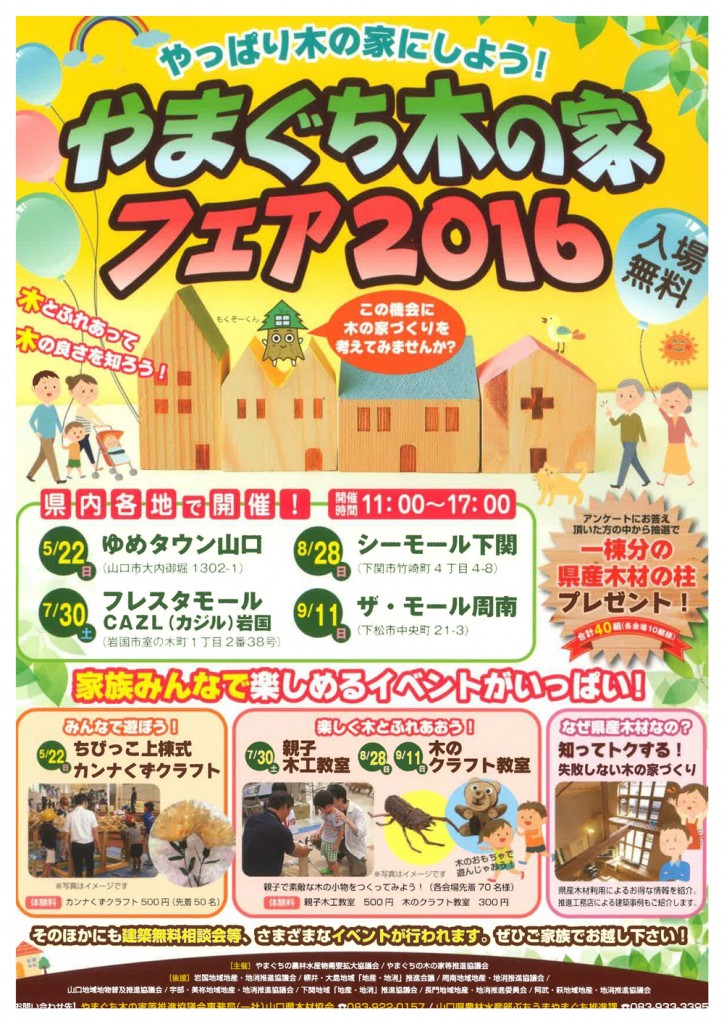 山口県産木材の利用拡大に向けた取組として、木の良さや県産木材の利用意義、優良県産木材を利用した住宅「やまぐち木の家」への助成制度等を紹介する「やまぐち木の家フェア」が今年も開催されます。