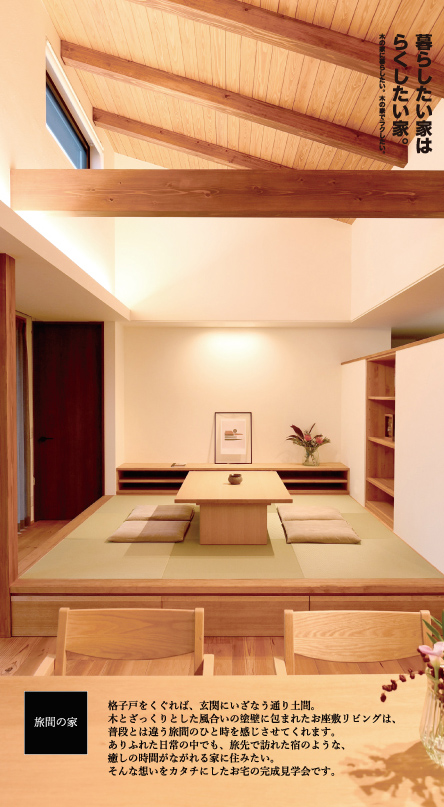 木とざっくりとした風合いの塗壁に包まれたお座敷リビングは、