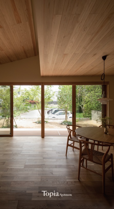 思わずウトウトしてしまうような心地よい木漏れ日が射したり、爽やかな風が吹いたり、明るい緑陰に身も心も落ち着き、日暮れにはやわらかなあかりに包まれる平屋です。