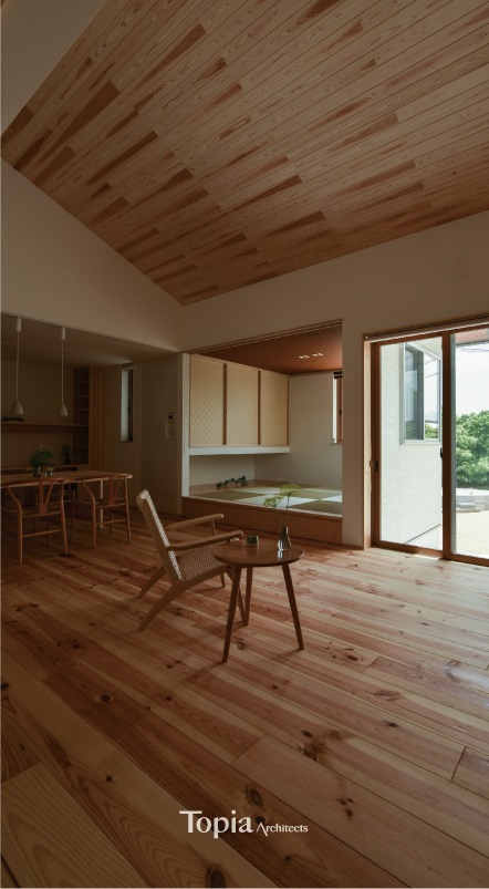 個室もつなげてリビングは広く、窓は新緑と空を取り込んで外と内をつなげます。