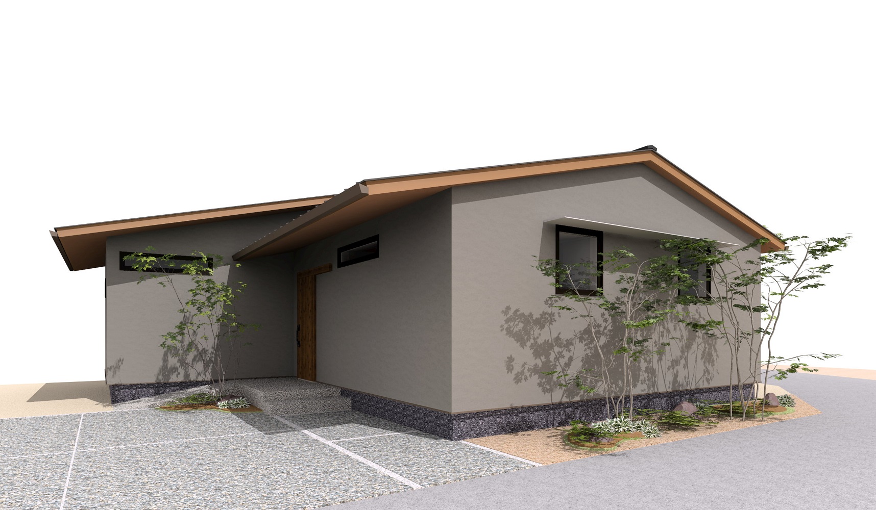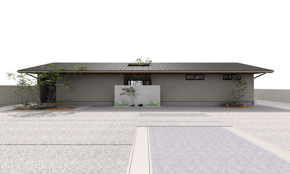 東西に長い敷地を活かし、一直線に長く深い軒先ラインと、植栽の美しいラインの対比を感じられる外観を構成いたしました。